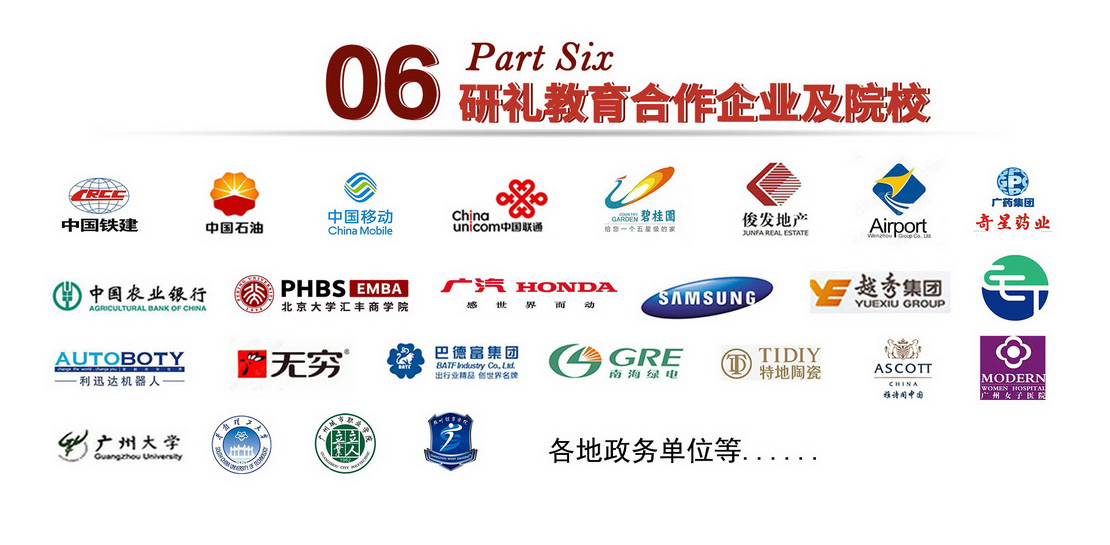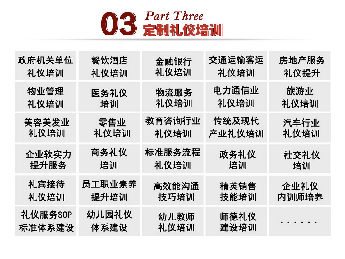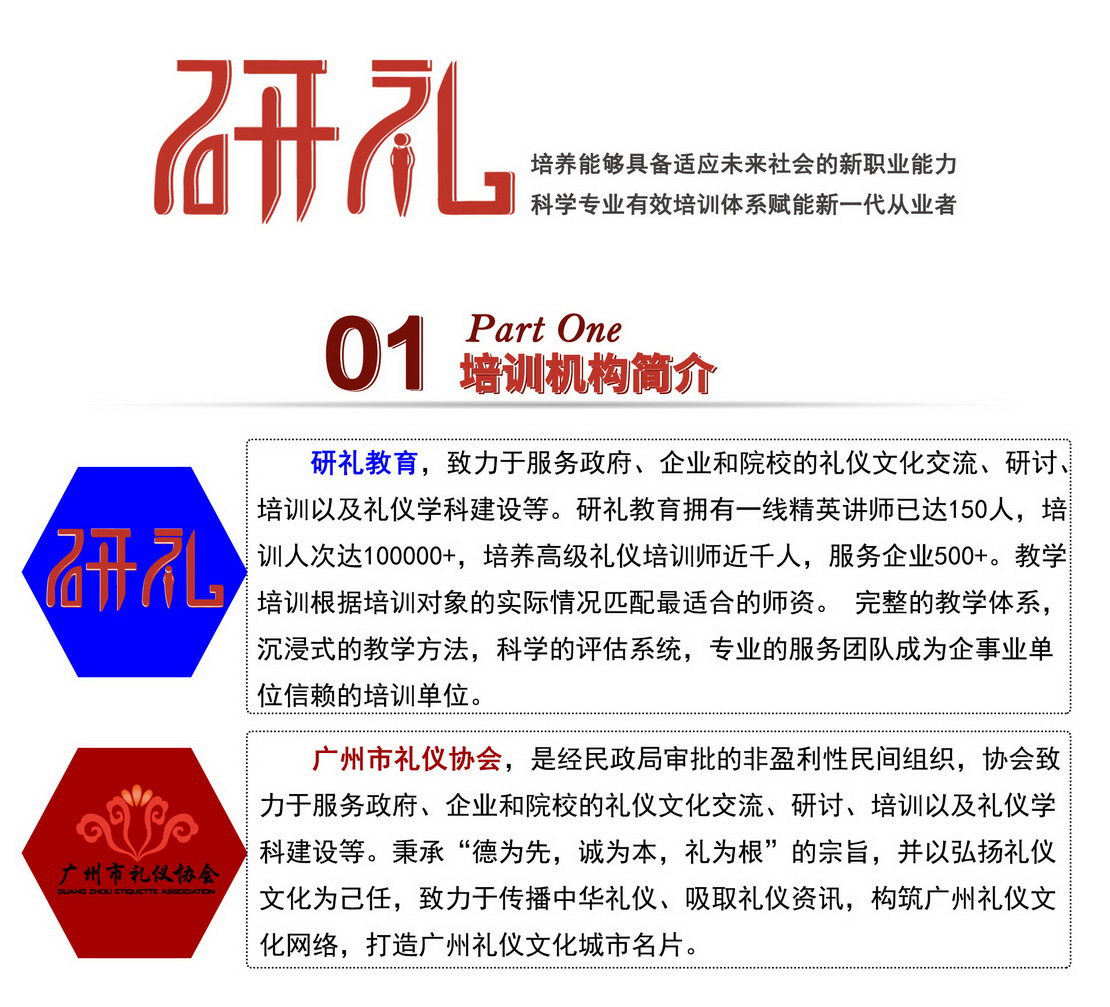 研禮教育,致力于服務(wù)政府、企業(yè)和院校的禮儀文化交流、研討、培訓(xùn)以及禮儀學(xué)科建設(shè)等。研禮教育擁有一線精英講師已達(dá)150人,培訓(xùn)人次達(dá)100000+,培訓(xùn)高級(jí)禮儀培訓(xùn)師近千人,服務(wù)企業(yè)500+。教學(xué)培訓(xùn)根據(jù)培訓(xùn)對(duì)象的實(shí)際情況匹配最適合的師資。完整的教學(xué)體系,沉浸式的教學(xué)方法,科學(xué)的評(píng)估系統(tǒng),專業(yè)的服務(wù)團(tuán)隊(duì)成為企事業(yè)單位信賴的培訓(xùn)單位。