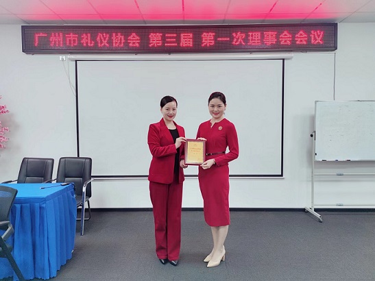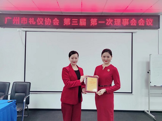 廣州市禮儀協(xié)會(huì)會(huì)長(zhǎng)時(shí)淑妍女士為新任執(zhí)行會(huì)長(zhǎng)彭莎女士頒發(fā)牌匾。