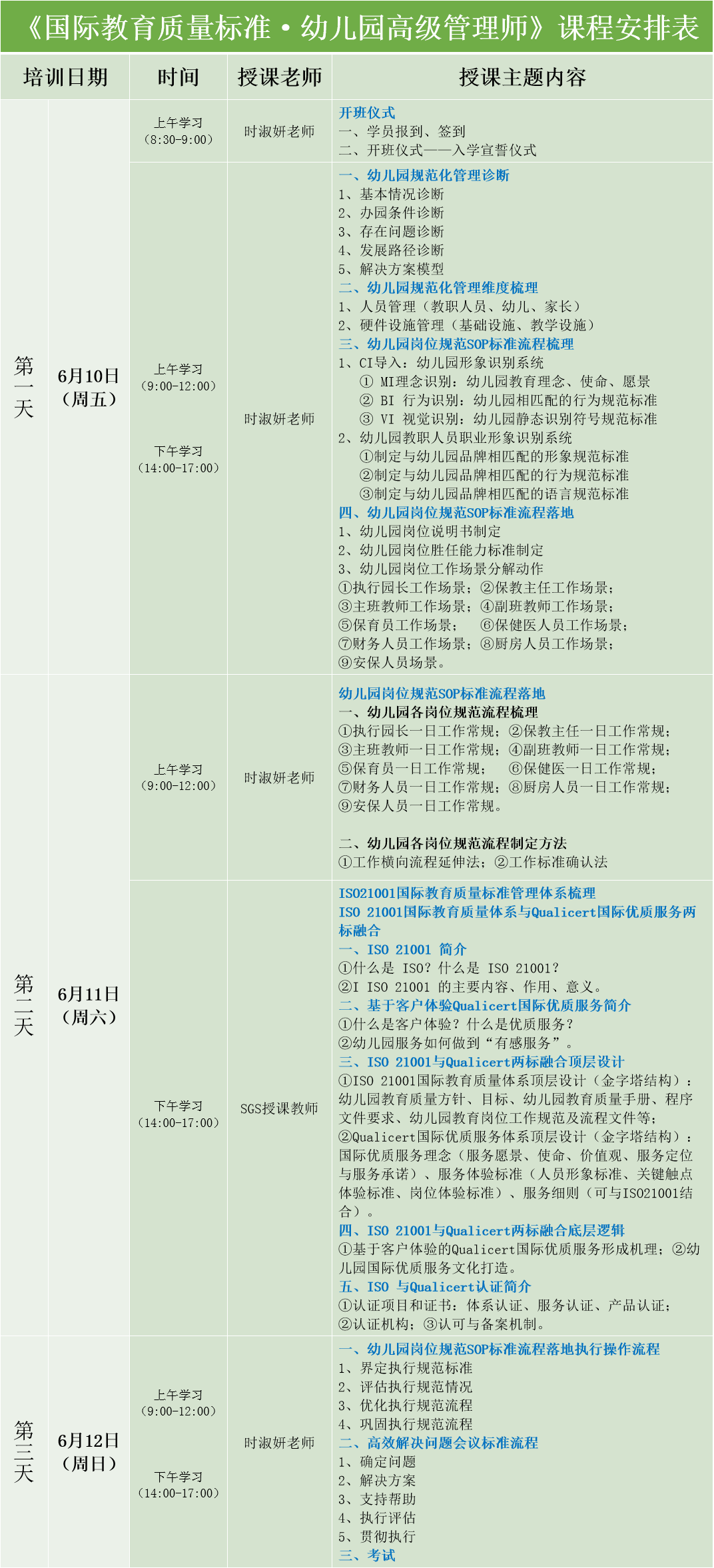為培養(yǎng)幼兒園高素質(zhì)管理人才,提升幼兒園科學(xué)、規(guī)范、高效管理工作,根據(jù)國際標(biāo)準(zhǔn)ISO 21001《教育組織管理體系—要求及使用指南》,結(jié)合《幼兒園崗位規(guī)范行為SOP標(biāo)準(zhǔn)流程管理體系》,通過系統(tǒng)化的教職工培養(yǎng)、規(guī)范化的工作流程,可視化的管理成果,把常規(guī)管理引向精細(xì)化管理,包括各項工作進(jìn)一步細(xì)化、量化、流程化、標(biāo)準(zhǔn)化。運用可操作、可復(fù)制、可評估的落地執(zhí)行的工具,實現(xiàn)幼兒園國際化教育質(zhì)量管理。