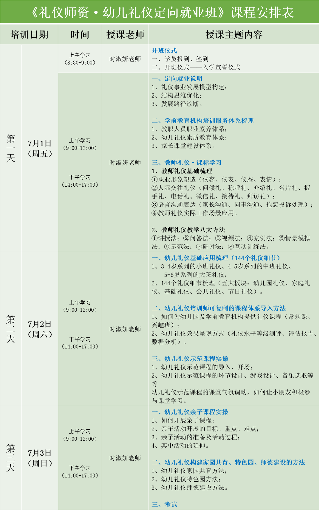 為加快高素質(zhì)禮儀培訓(xùn)師人才培養(yǎng)的步伐,增強(qiáng)禮儀培訓(xùn)師細(xì)分領(lǐng)域授課能力,全面提升禮儀培訓(xùn)師實(shí)際應(yīng)用解決問題能力,現(xiàn)面向以服務(wù)學(xué)前教育機(jī)構(gòu)(教職人員、幼兒、家長(zhǎng))的禮儀培訓(xùn)為職業(yè)發(fā)展方向人員,開展定向禮儀師資就業(yè)班。